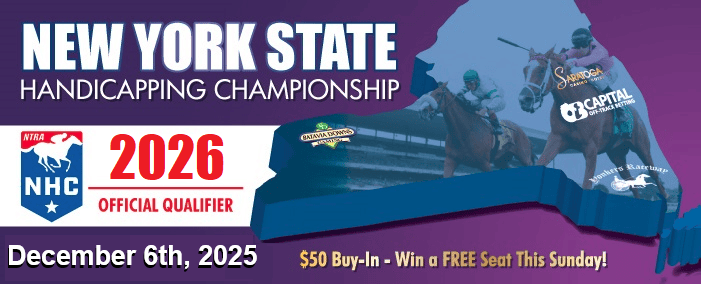 Register below for the 12/6 New York State Handicapping Championship! Comptetition begins at 9:00am! Please note that in order to participate, you MUST be an NTRA member. NTRA Registration is available HERE for all participating horseplayers.